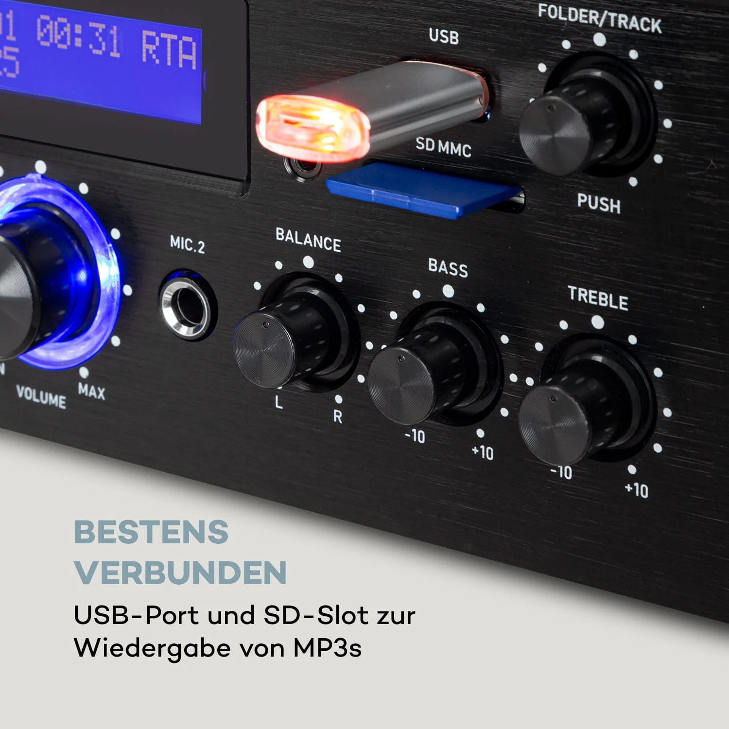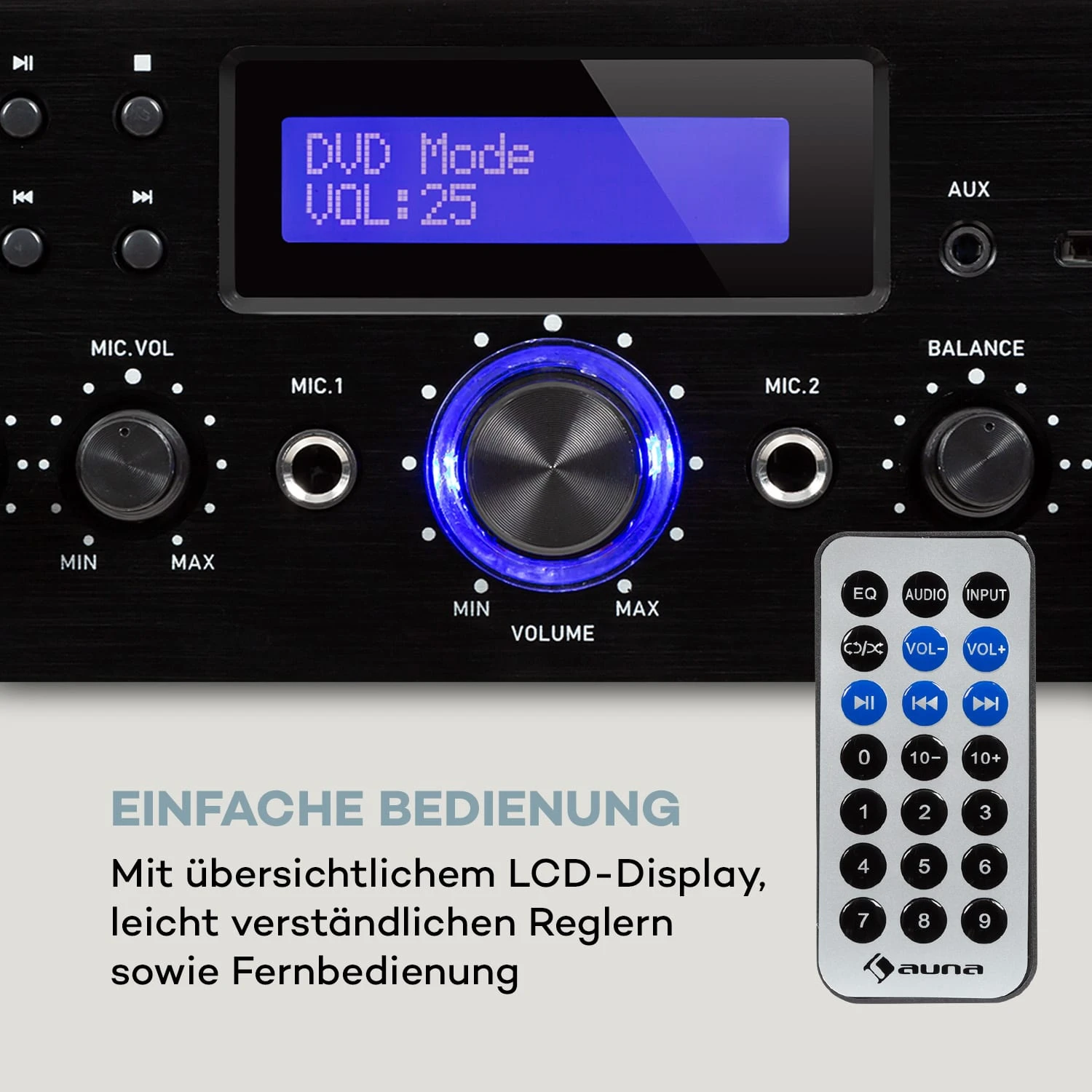 Ausgestattet mit einer Bluetooth-Schnittstelle können sämtliche Audio-Dateien innerhalb einer Entfernung von 20 Metern drahtlos und bequem von Smartphone, Tablet oder Laptop über den auna AMP-5 BT HiFi-Verstärker abgespielt werden. Zusätzlichen Audio-Input erhält er wahlweise über einen AUX-, CD- oder DVD-Eingang sowie per USB-Port und SD-Slot. Zwei frontseitige Mikrofon-Eingänge machen den Verstärker zur vollwertigen Karaokemaschine bei der nächsten Heimparty mit Familie und Freunden. Selbstverständlich können sie separat in Lautstärke und Klang geregelt sowie mit Echo-Effekten versehen werden. Auch alle anderen Input-Signale ermöglichen die Feinjustierung mit Höhen-, Tiefen- und Balance-Reglern. Das fertig geregelte Audiosignal wird rückseitig an die Stereo-Landschaft ausgegeben. Zwei Stereo-Anschlüsse liefern dafür jeweils 50 Watt RMS Leistung. Der RCA-Recorder-Ausgang bietet zusätzlich die Möglichkeit zur Aufzeichnung von Musik und Gesangseinlagen. Abgerundet wird das kompakte und schlichte Design des HiFi-Verstärkers durch ein ansehnliches, schwarzes Frontpanel mit großem LED-Display und schwarzen Reglern.
