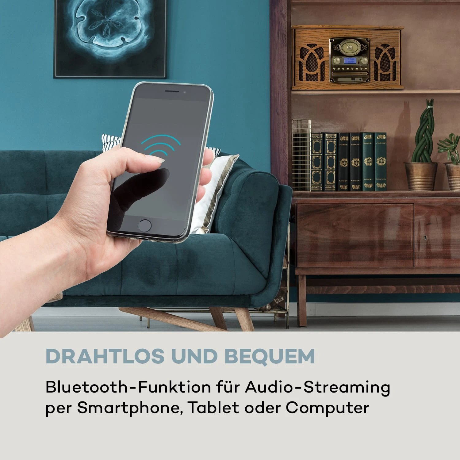 Die auna NR-620 DAB Stereoanlage verbindet die Vergangenheit mit der Zukunft: Sie bietet zahlreiche Abspielmöglichkeiten und beeindruckt durch ihr nostalgisches Design.