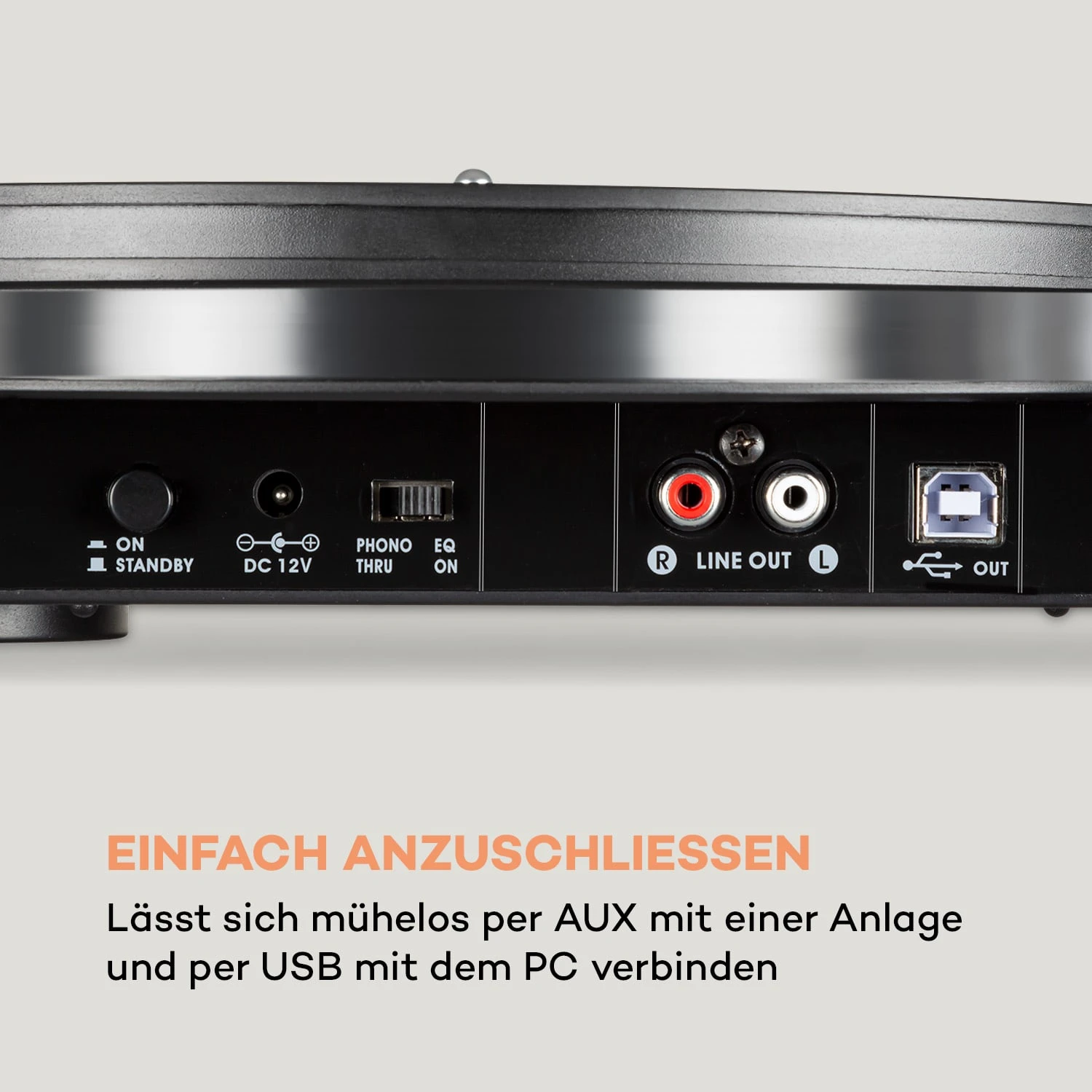 Der auna Pureness Plattenspieler liefert nur den besten Sound. Laufruhig lässt er per Riemenantrieb Schallplatten mit 33 1/3 oder 45 U/min kreisen. Für besten Klang sorgt das MM-Tonabnehmersystem, per Pitch Control kann die Drehgeschwindigkeit geregelt werden. Außerdem ermöglicht der Plattenspieler das Aufnehmen und Umwandeln von Schallplatten in MP3s: Dazu wird das Gerät einfach per USB-Kabel mit einem PC verbunden. Mit einer gratis herunterladbaren Software lassen sich nun ganz einfach MP3s von Vinyl-Liedern erstellen.