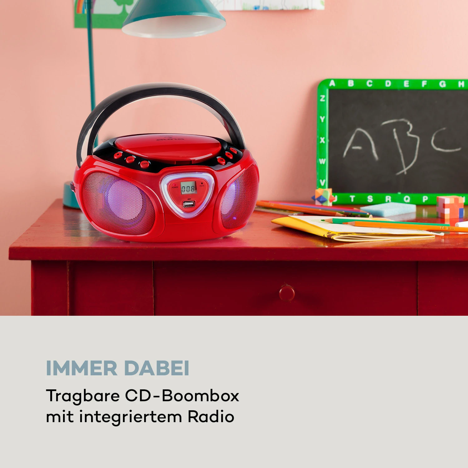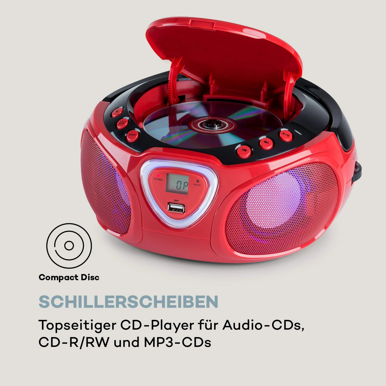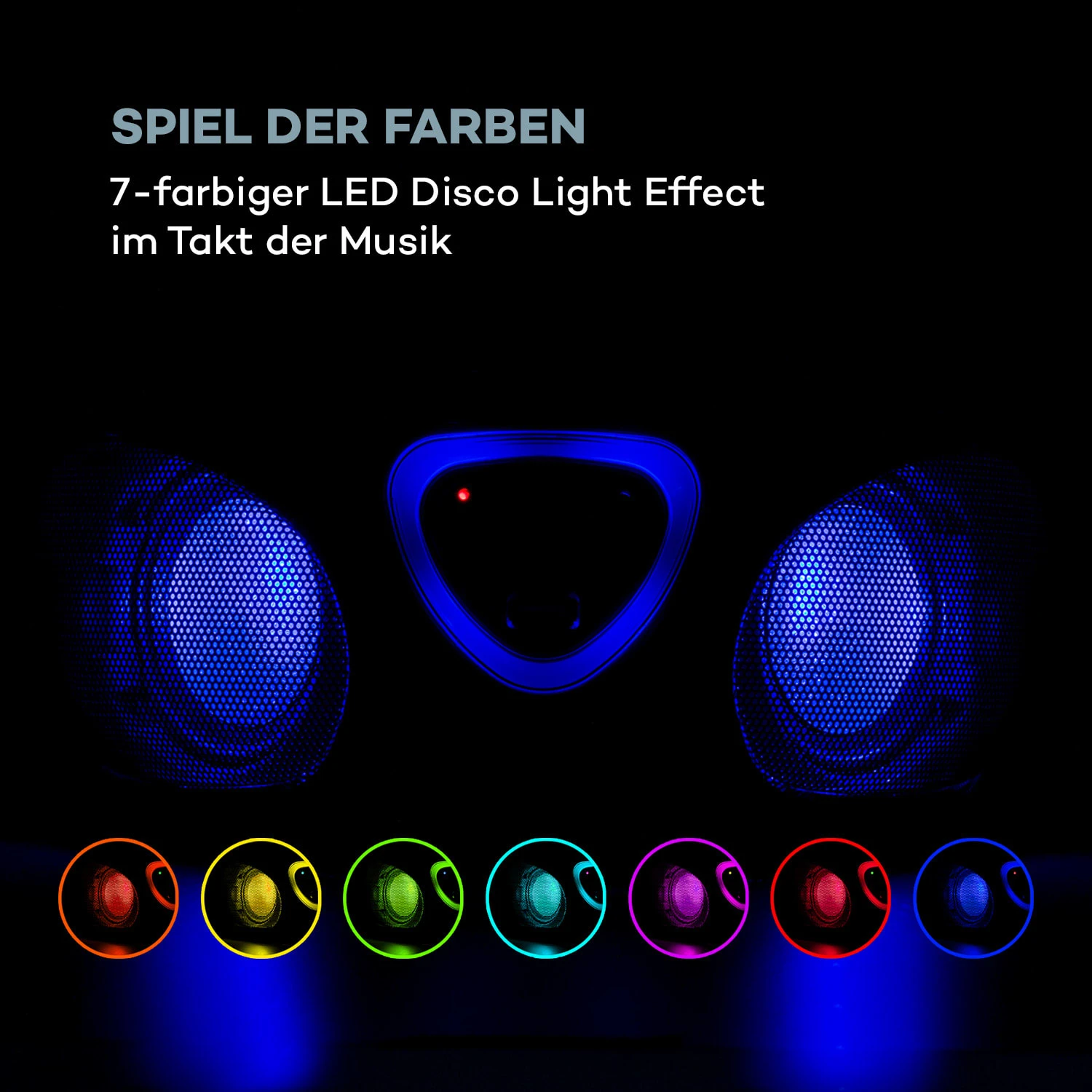 Flashdance! Die auna Roadie CD Boombox lässt die Farben tanzen und bringt mit CD-Player, Bluetooth 5.0 Konnektivität und FM-Radio ordentlich Schwung in die Hütte.