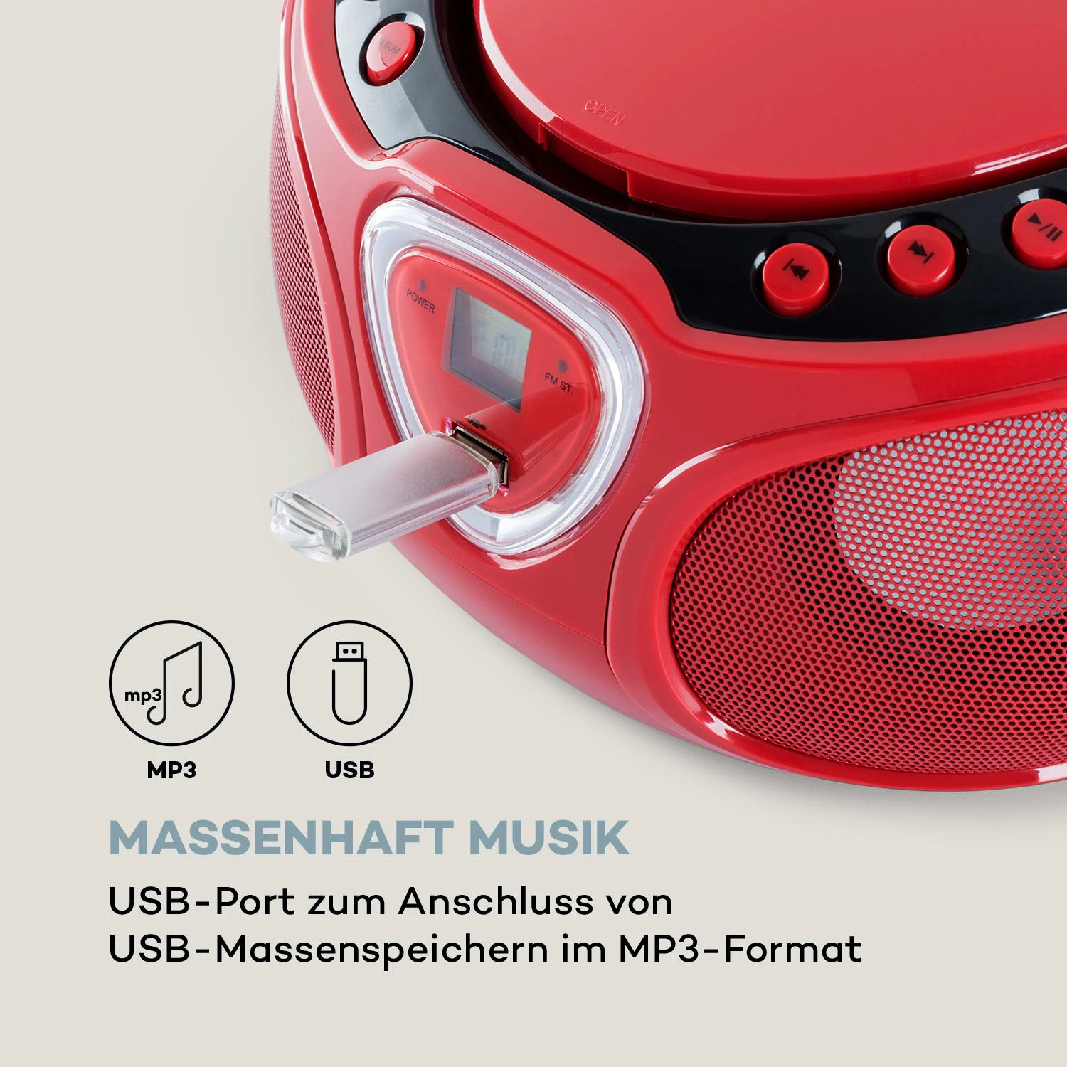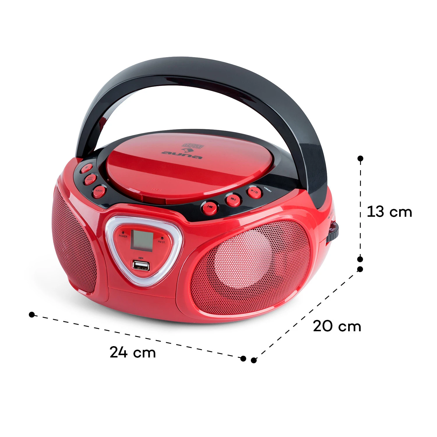 Bei der auna Roadie Boombox kannst du den Rhythmus nicht nur hören, sondern auch sehen. Mit 7-farbigem LED Disco Light Effect tanzt die portable Minianlage im Takt der Musik. Im topseitigen CD-Player finden Audio-CDs genauso Aufnahme, wie selbst zusammengestellte Sampler im MP3-Format. Das geht natürlich genauso per Stick und integriertem USB-Port. Über die Bluetooth 5.0 Schnittstelle verbinden sich Tablet, Smartphone oder Stereoanlage und streamen ganz easy ihre Musik auf den kleinen Roadie – what a feeling! Das integrierte FM-Radio liefert Musik, Unterhaltung und Informationen von deinen lokalen Radiosendern.