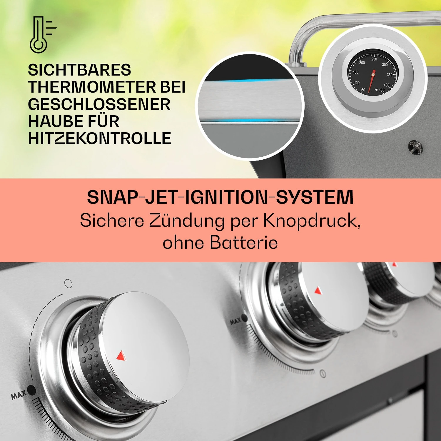 Die Grillsaison kann kommen! Der Klarstein Tomahawk Gasgrill mit 4 Brennern und einem Sideburner verspricht Grillgenüsse in höchster Qualität. Durch seine große Grillfläche, eine starke Hitzeleistung und das edle Design wird die Essenszubereitung zum reinsten Brutzelvergnügen.